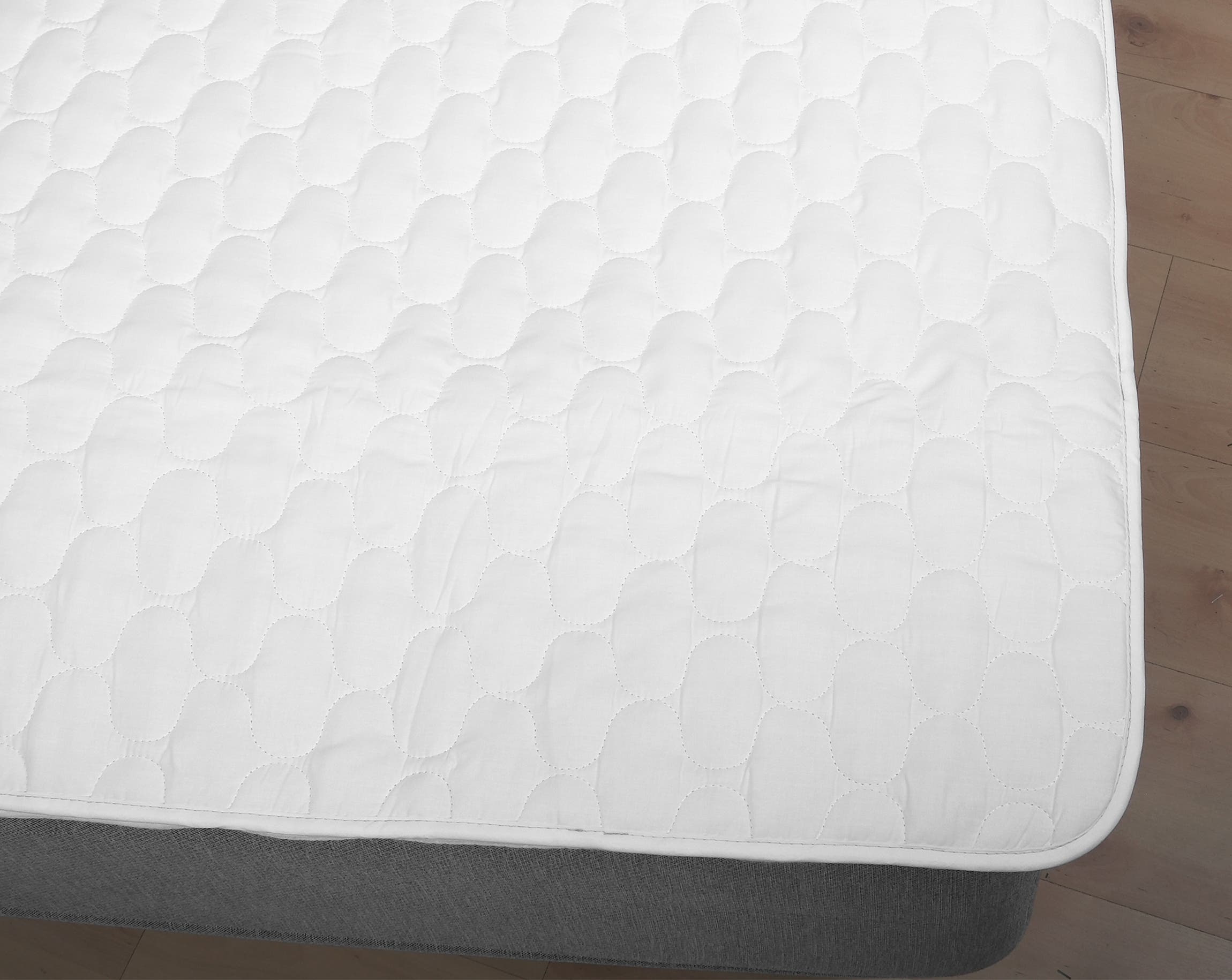 Quilted mattress protector in cotton/polyester with integrated PU barrier layer.