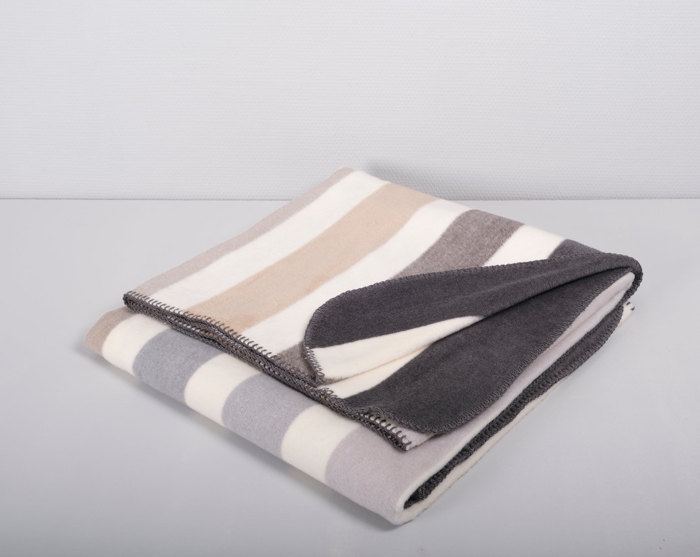 En pläd med horisontella ränder i färgerna offwhite, beige och grå toner.